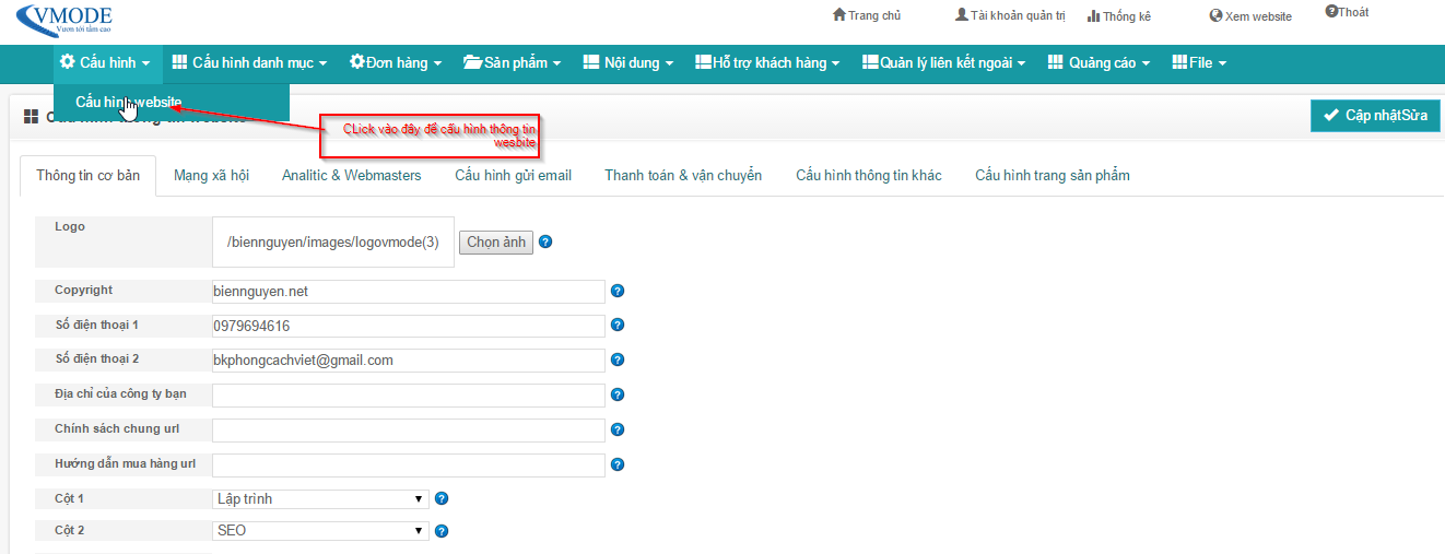 Sau khi đến trang cấu hình website.Trang quản trị sẽ xuất hiện các tabs.Với mỗi chức năng cấu hình sẽ được phân vào các tabs thích hợp. Để cấu hình thông tin website các bạn điền thông tin website bạn vào form( trường nào các bạn không có thông tin thì có thể để trống).Sau khi điền thông tin xong các bạn nhấn nút cập nhật ở dưới chân trang hoặc ở trên cùng trang để cập nhật nội dung bạn vừa điền vào form.